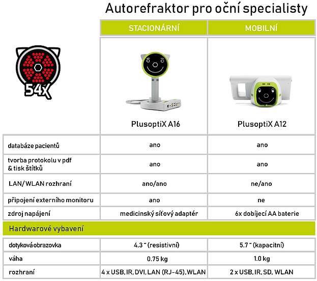 Screeningový přístroj Plusoptix A16 a Plusoptix A12 zprostředkovávají identickou kvalitu měření. Optický systém, počítačová deska a měřící algoritmus je stejný pro oba přístroje. Zatímco přístroj Plusoptix A12 je zcela přenosný (mobilní varianta), k Plusoptixu A16 je třeba připojit klávesnici a monitor (stacionární varianta). Oba přístroje vyhovují náročným požadavkům očních profesionálů, kteří pracují s dětmi.